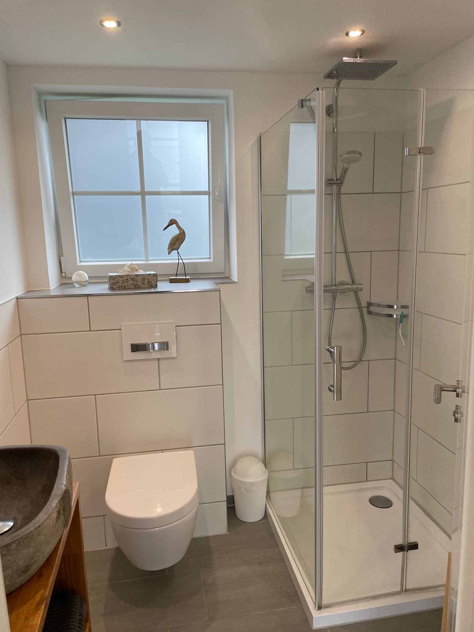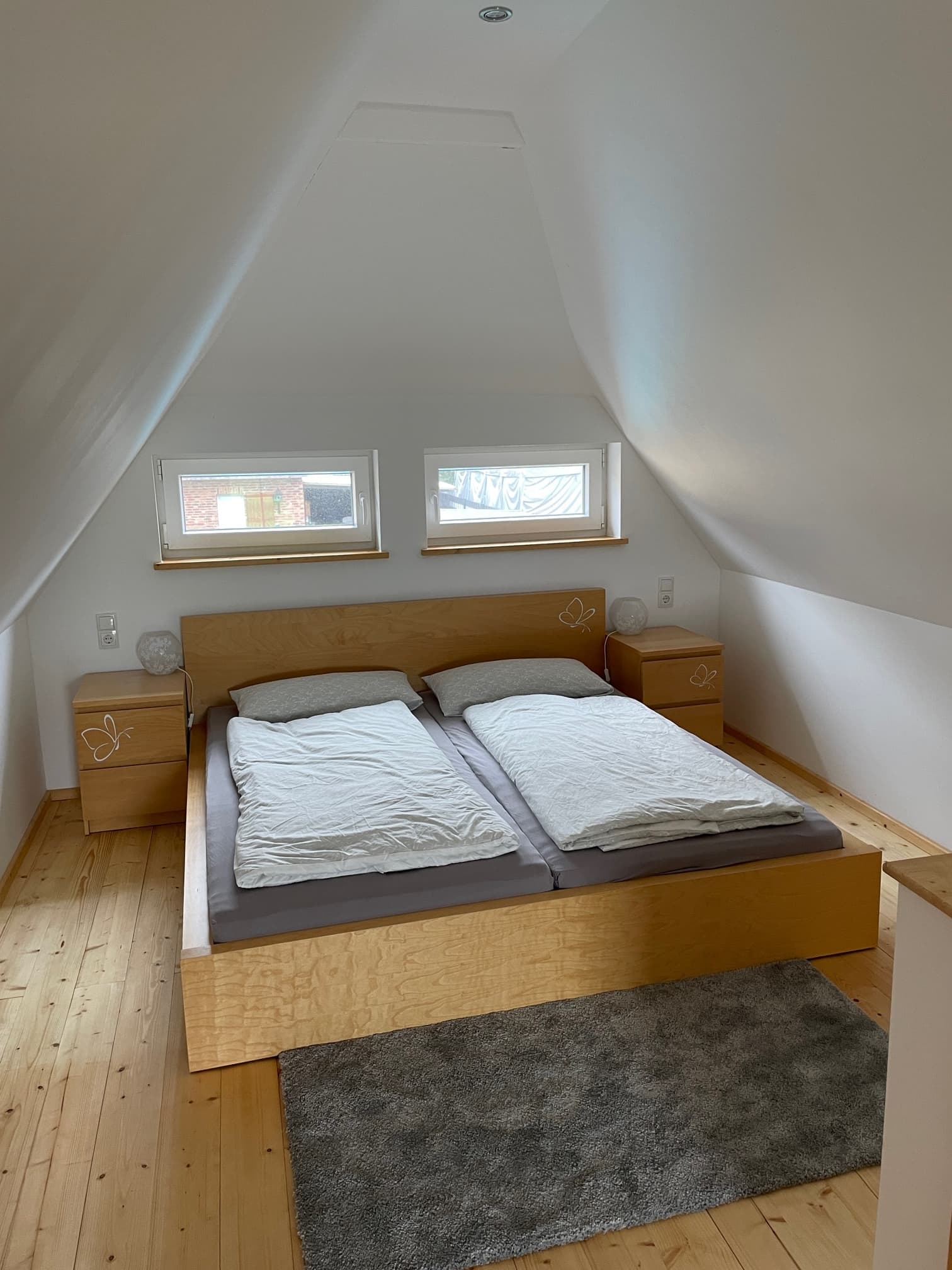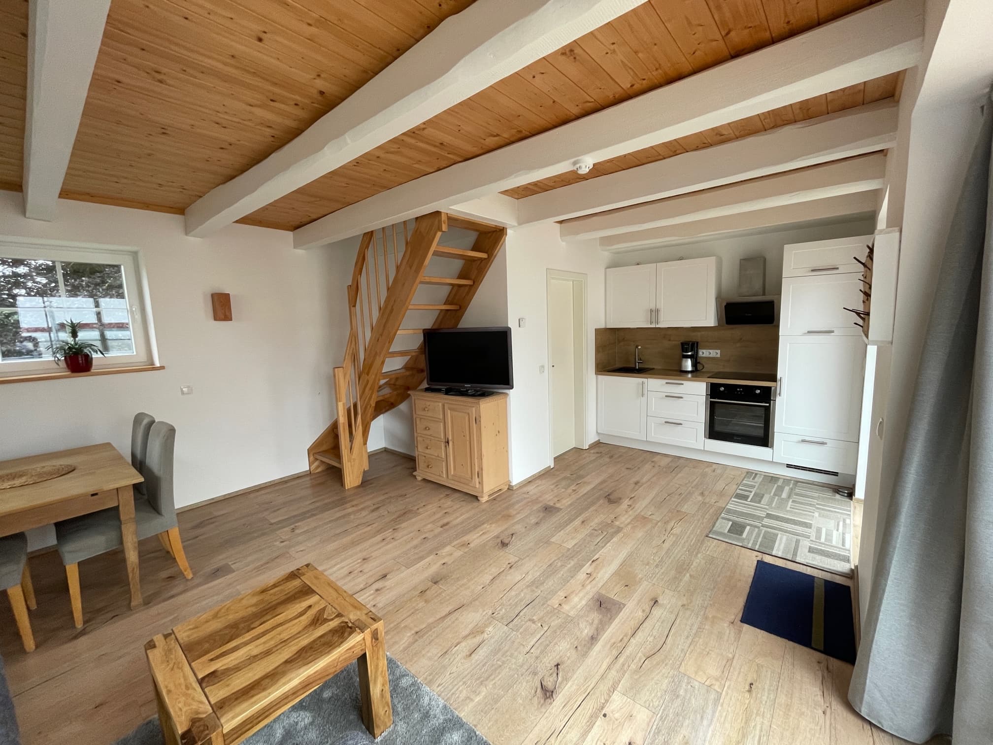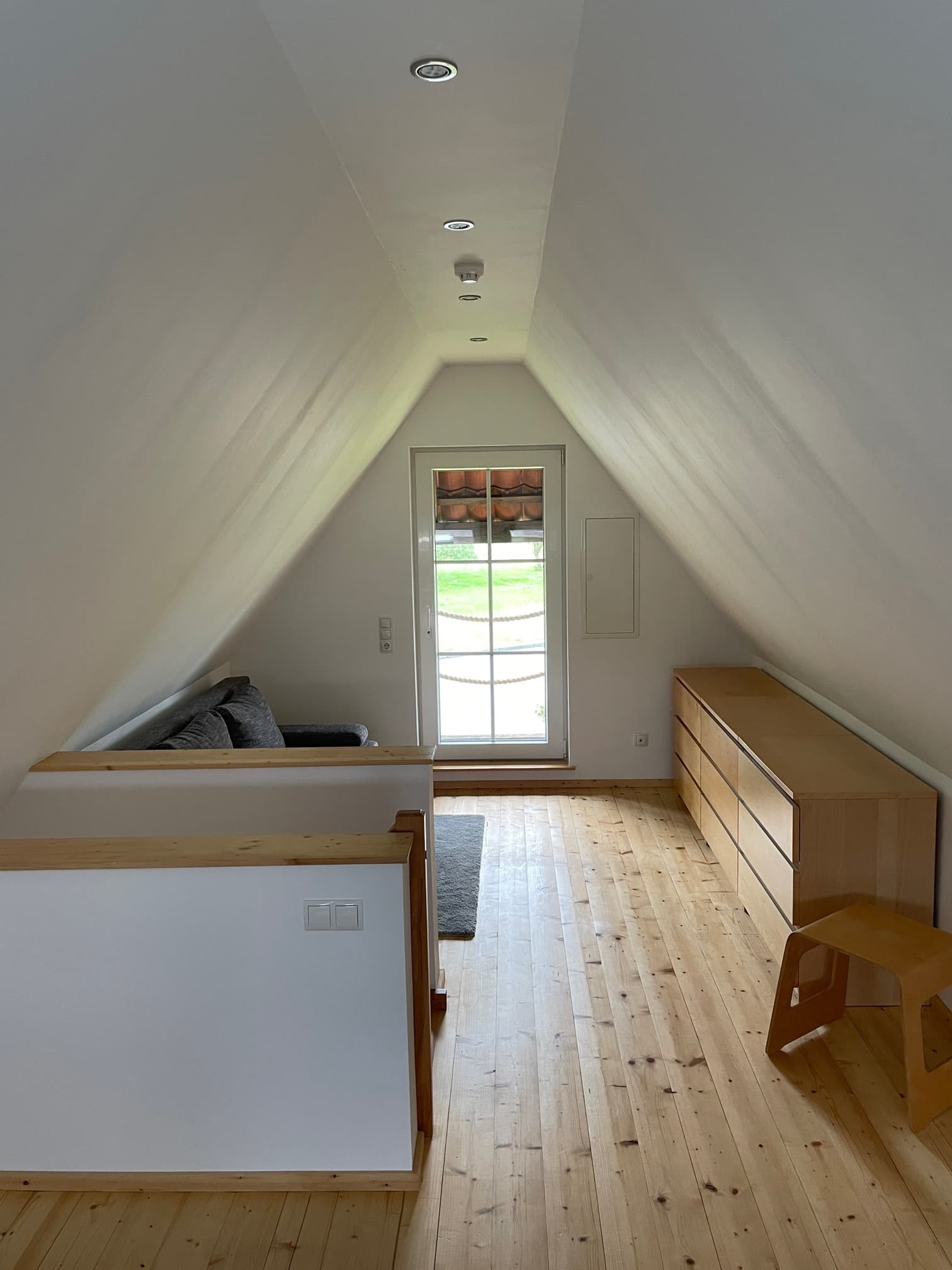 Im Erdgeschoss befindet sich die Wohnküche mit Essbereich und das Badezimmer mit Dusche. Über eine schöne Holztreppe gelangt man ins Obergeschoss mit dem Schlafbereich. Zusätzlich gibt es noch einen kleinen Balkon in der oberen Etage mit Blick auf die gegenüberliegende Pferdekoppel.