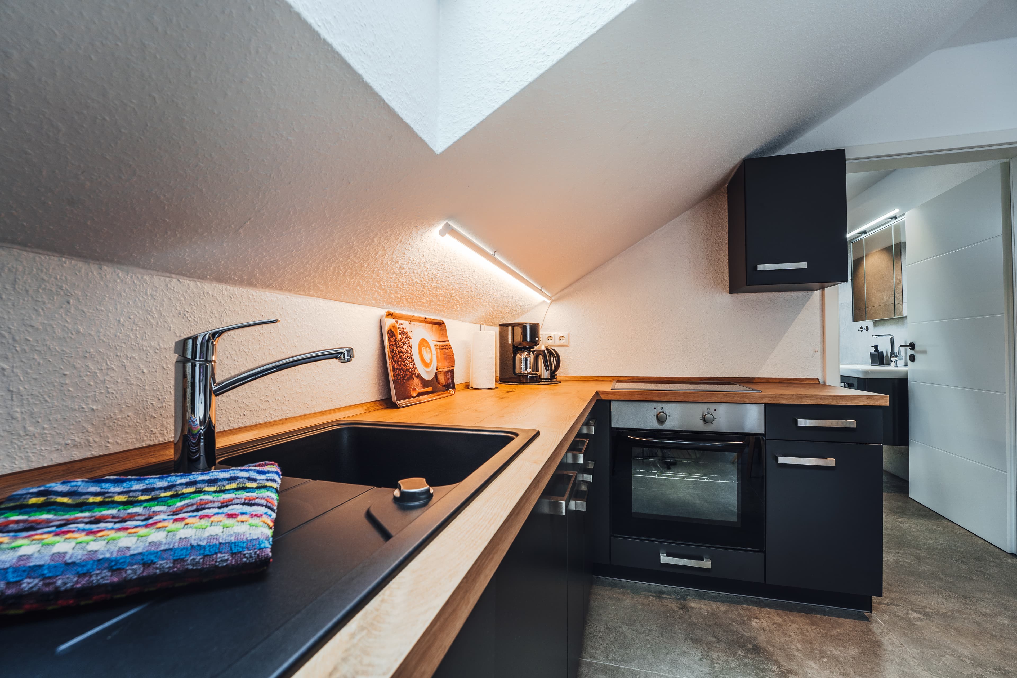 Die hell und geschmackvoll eingerichtete Ferienwohnung für zwei Personen, befindet sich im Obergeschoss des Ferienhauses. Sie verfügt über eine komplett eingerichtete Küchenzeile im Wohn-Essbereich, ein Schlafzimmer mit einem Doppelbett sowie ein Bad mit WC und Dusche. Genießen Sie die Ruhe und Sonne auf der möblierten Dachterrasse.