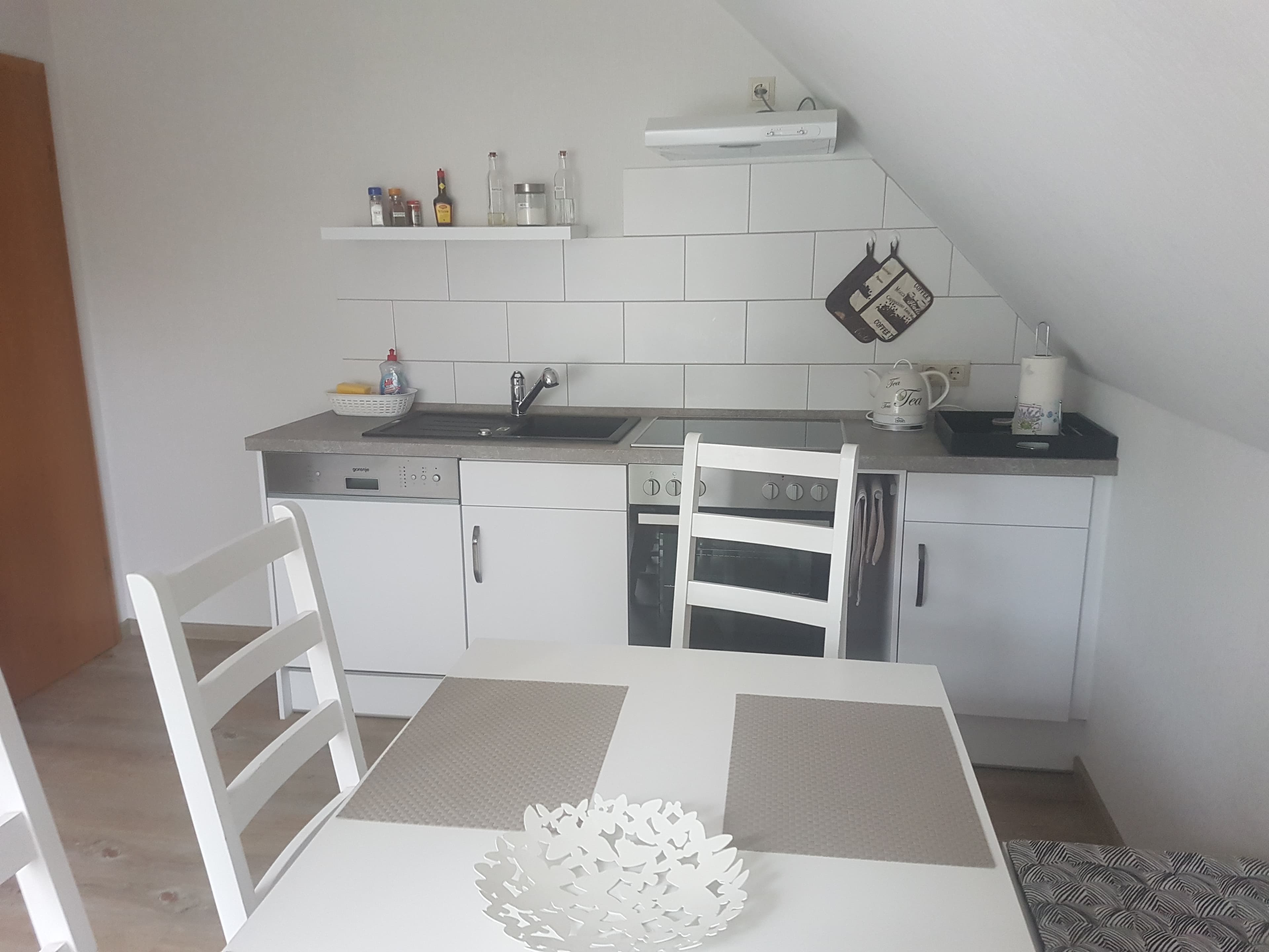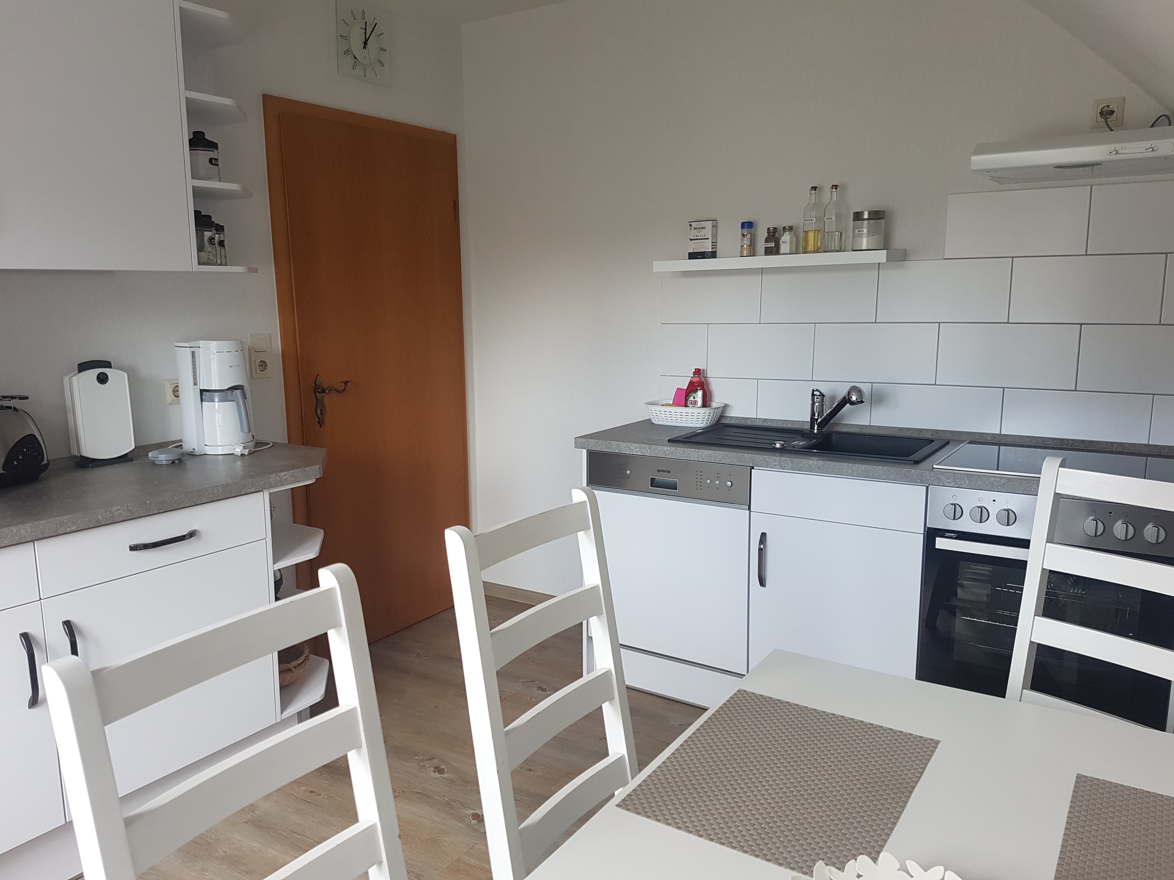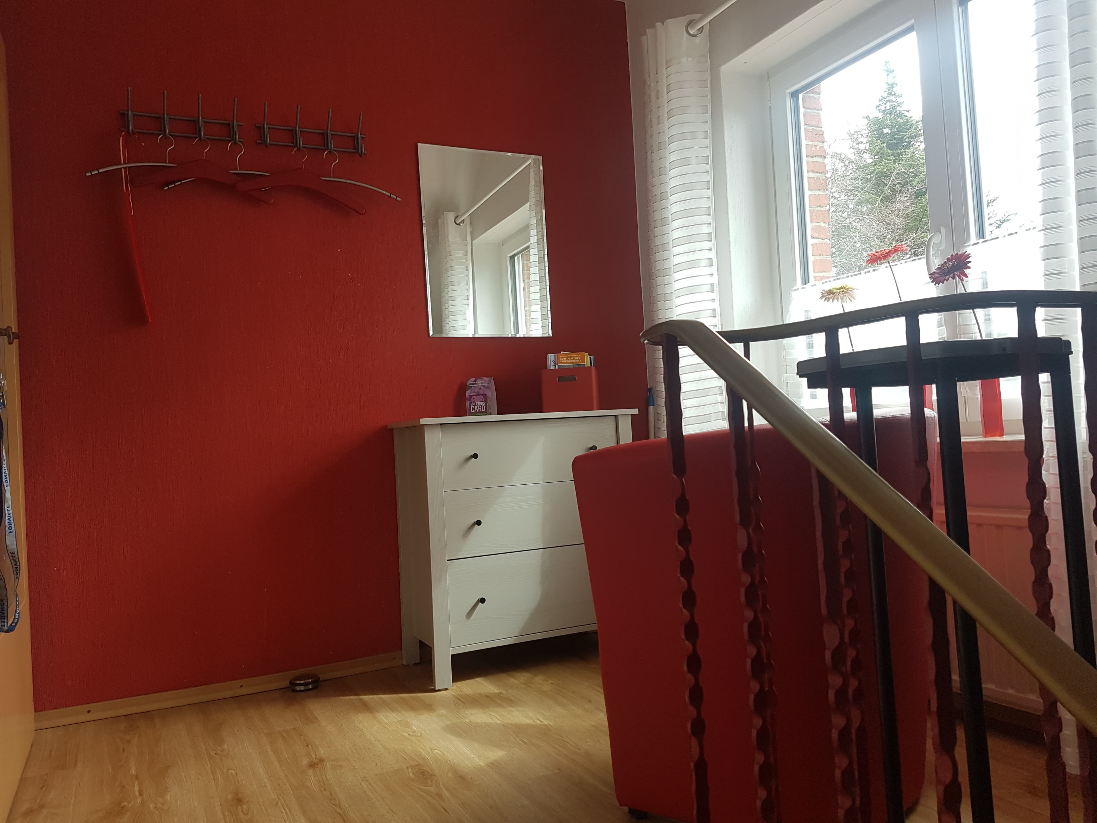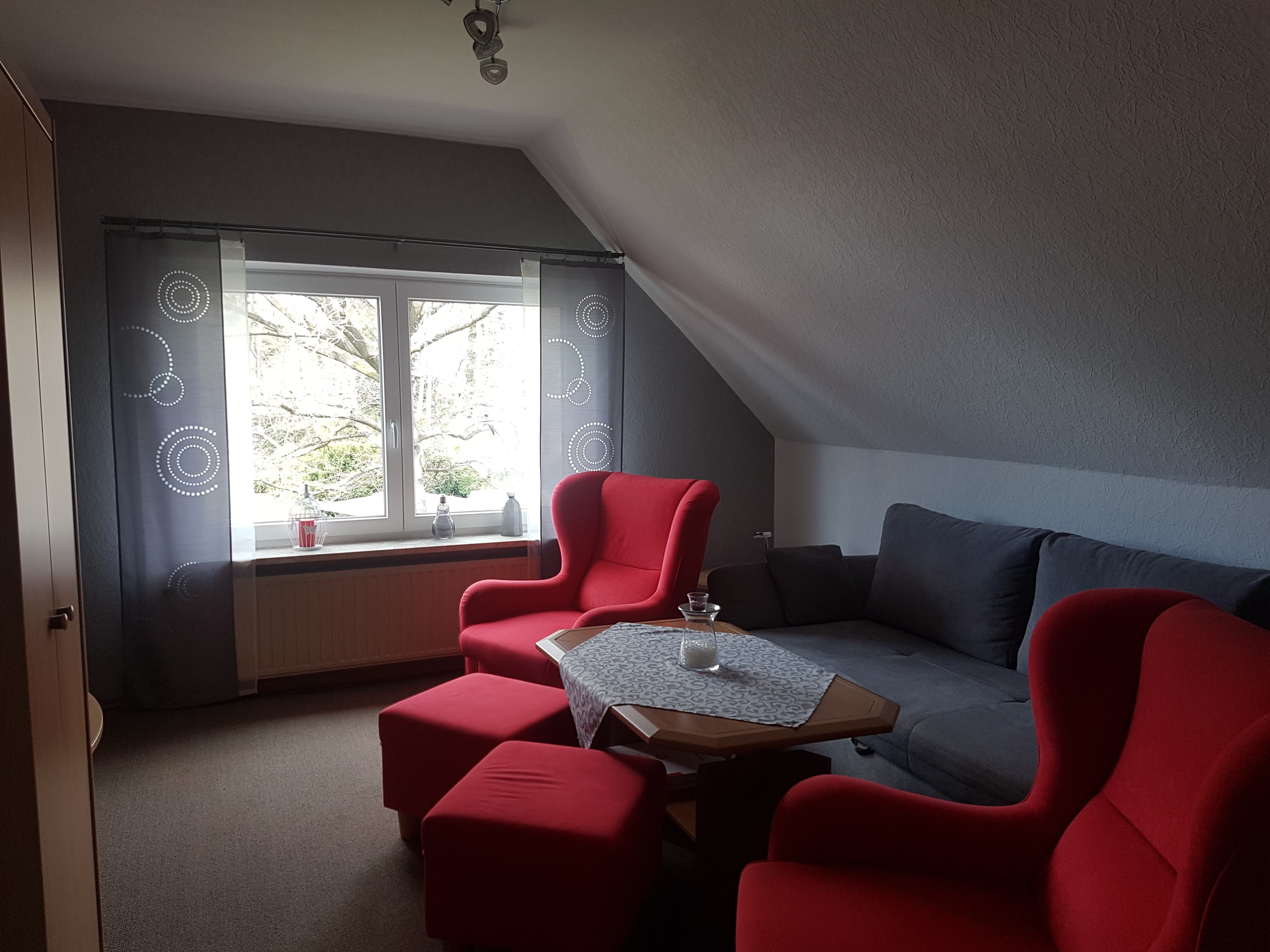 Ferienwohnung im Obergeschoss, ca. 60qm groß; 1 Wohn-Schlafzimmer, 1 Schlafzimmer mit Doppel-und Einzelbett, Küche und Vollbad mit Duschvorrichtung. Gartenhaus mit Grillmöglichkeit, Autostellplatz, Fahrradverleih möglich, Sat TV.