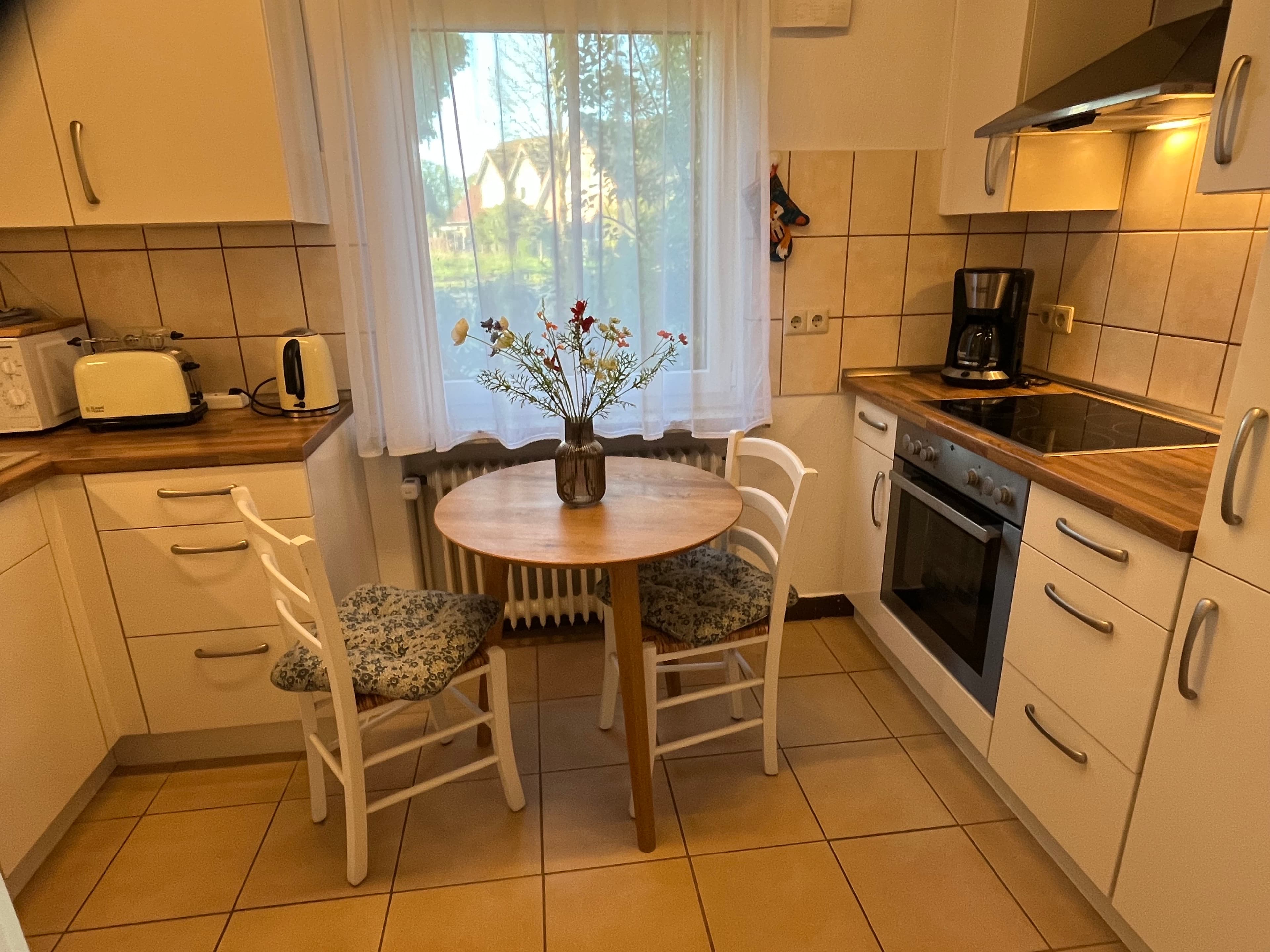Die Einbauküche ist komplett ausgestattet durch Elektroherd mit Backofen, Kühlschrank mit Gefrierfach, Spülmaschine, Mikrowelle, Wasserkocher, Kaffeemaschine, Toaster, Rührgerät und diverse Küchenutensilien.