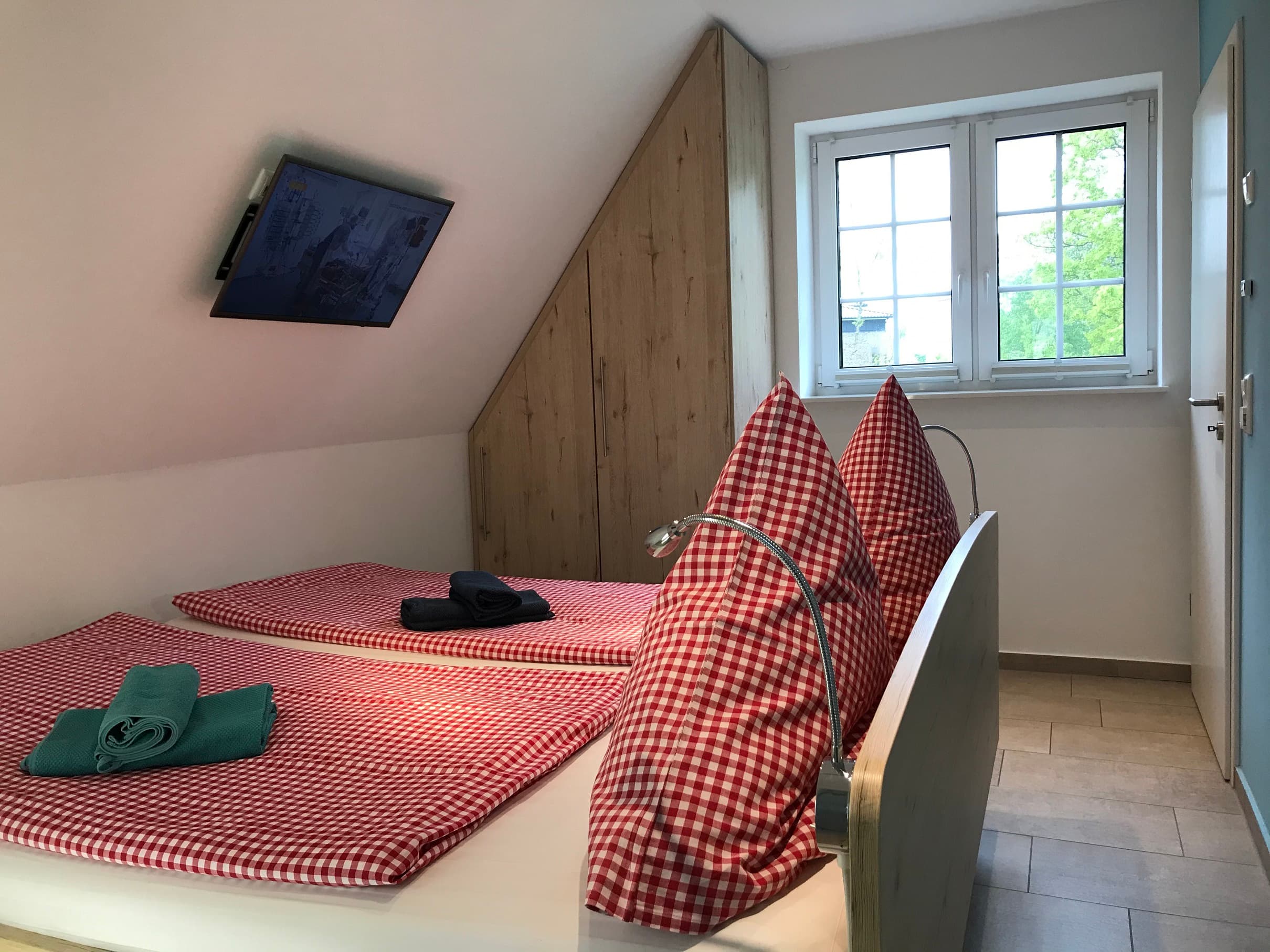 - zwei Schlafzimmer: eines mit Doppelbett, das andere mit zwei Einzelbetten mit jeweils ein Smart-TV-Gerät und Blick auf den Waldbereich des Grundstücks, der regelmäßig von Rehwild besucht wird