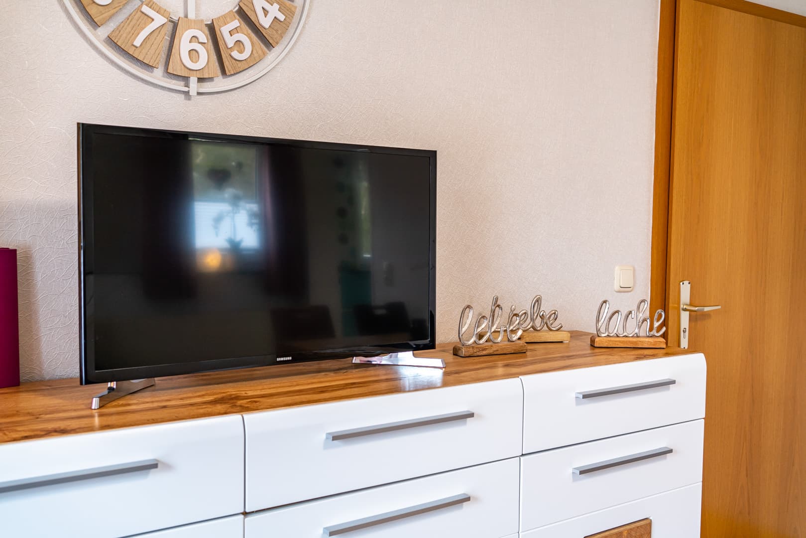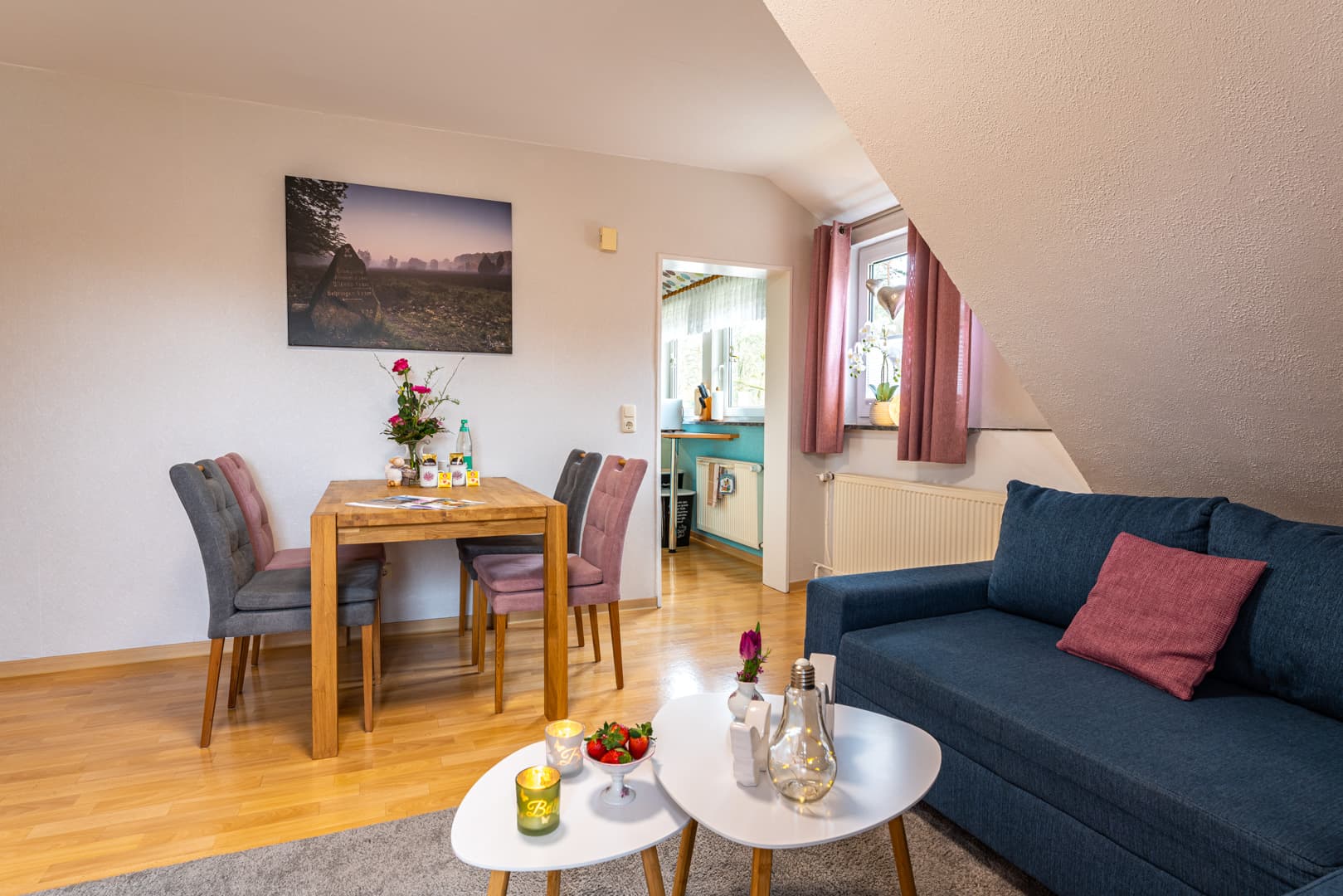 Im 1. Obergeschoss, auf 45 qm, bietet die Nichtraucherwohnung für 2-3 Personen eine optimale Wohnqualität, in der Sie den Alltag hinter sich lassen können. Nach einem langen Tag können Sie im Wohnzimmer auf unseren Sitzgruppen bei einem Roman oder einem guten Film entspannen (Sat und TV vorhanden).