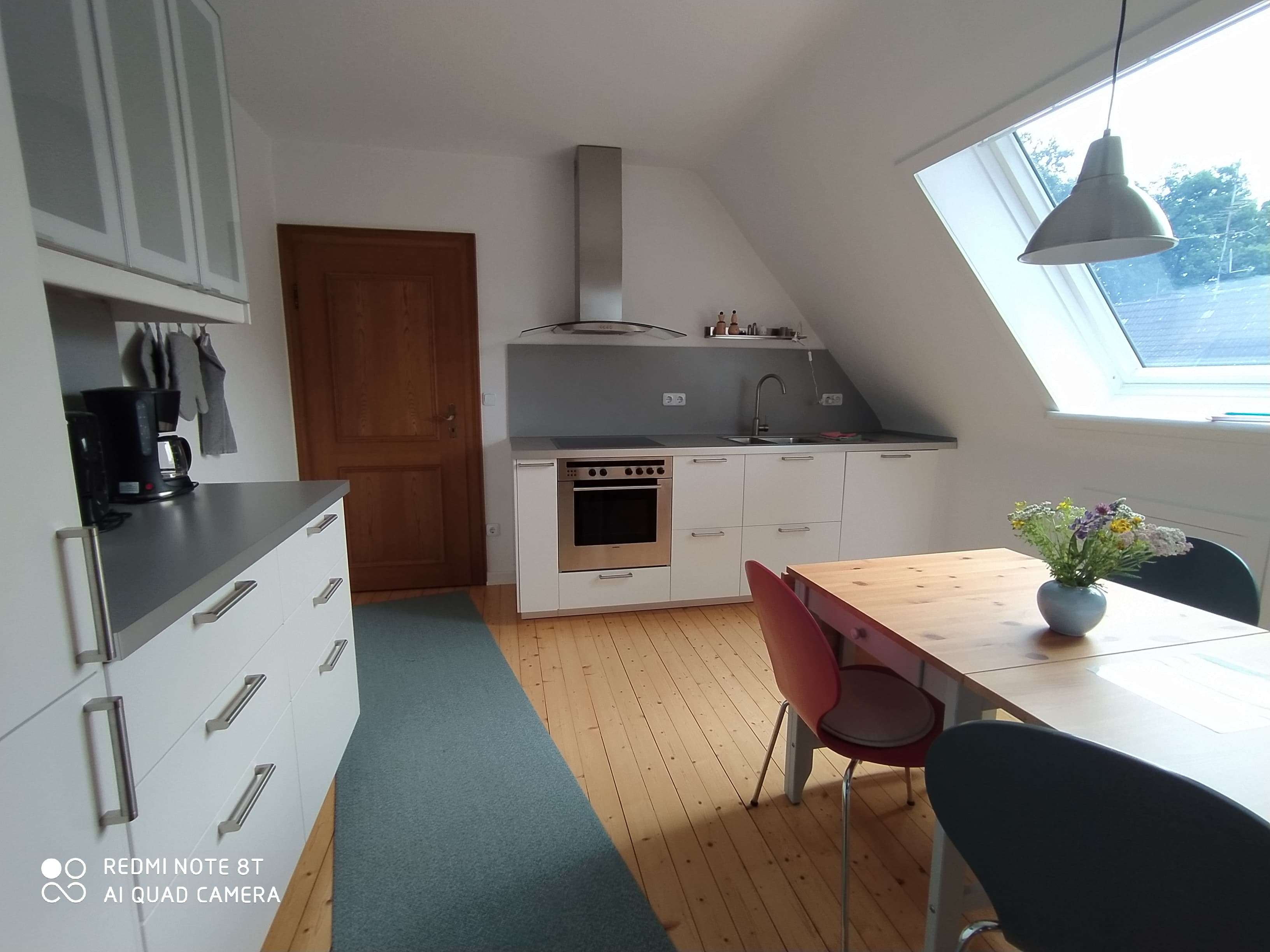 Die Ferienwohnung umfasst das gesamte Obergeschoss. Sie besteht aus zwei Schlafzimmern (davon eins mit direktem Zugang zum Balkon), einem geräumigen Bad mit Badewanne, Dusche und WC, einem "halben" Bad (dabei handelt es sich um eine geräumige Toilette, wo man auch mal am Waschbecken die Zähne putzen kann), einer Küche mit E-Herd, Backofen, Mikrowelle, Geschirrspüler und Kühl-/Gefrierschrank und dem großen Wohnzimmer mit Balkon.