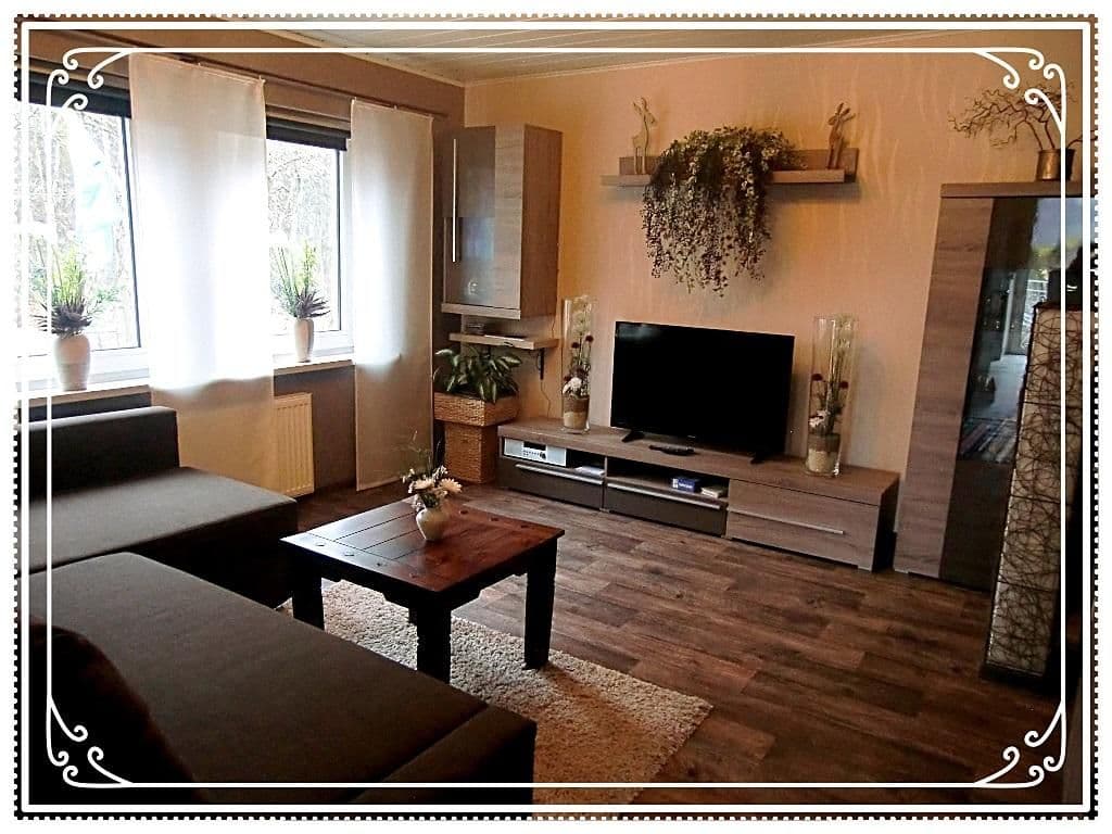 Das Wohnzimmer ist geschmackvoll in Braun/Creme eingerichtet. Es bietet ein bis maximal zwei Schlafmöglichkeiten auf dem gemütlichen, ausziehbaren Sofa (140x210 cm). Dieses dient auch als Sitzgelegenheit. Die Fenster sind durch Rollos zu verdunkeln. TV vorhanden, PS 3 vorhanden, CD/Radio und blu-ray Player vorhanden.