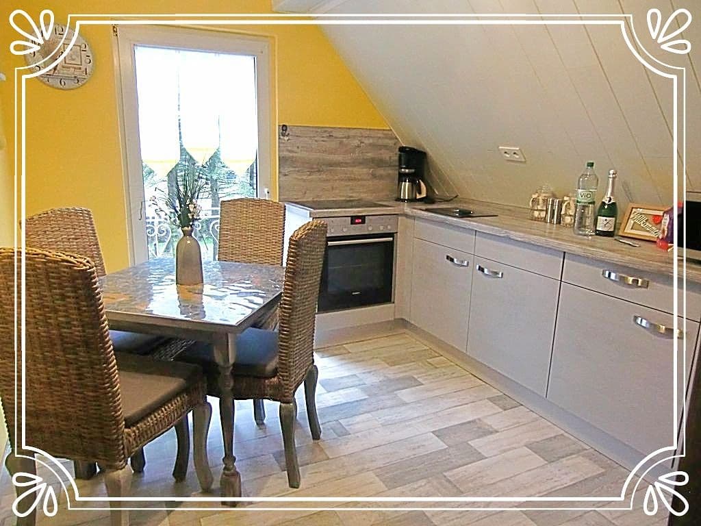 Die elegant und hochwertig eingerichtete Küche ist ausgestattet mit einem E-Herd/Backofen, Cerankochfeld, Wasserkocher, Kaffeemaschine, Kühlschrank mit Gefrierfach und Mikrowelle. Darüber hinaus verfügt sie über eine Sitzecke für bis zu 4Personen.