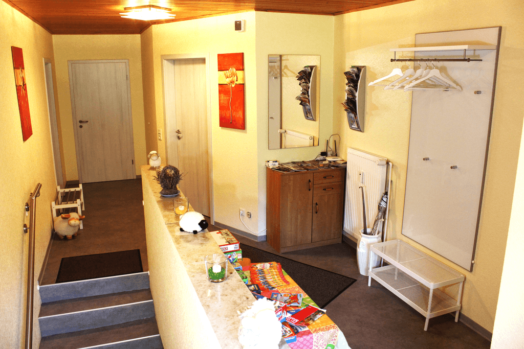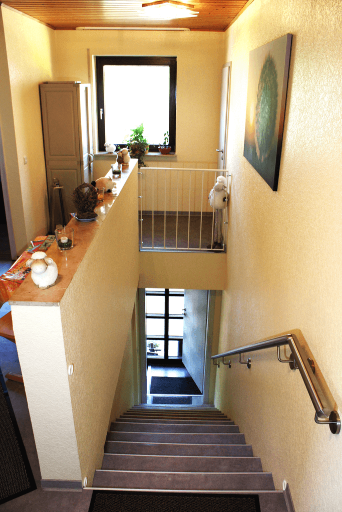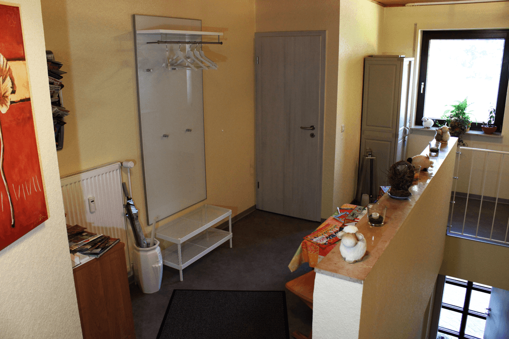 Großer Flur freundlicher Treppenaufgang mit Wandhandlauf und Treppenschutzgitter, Spiele- und Maltisch sowie 3 Schulstühle, Wandgarderobe und Spiegel, kleines Schränkchen und zwei Schuhregale, Regenschirmständer mit Regenschirm, langer Schuhlöffel/ Anzieher