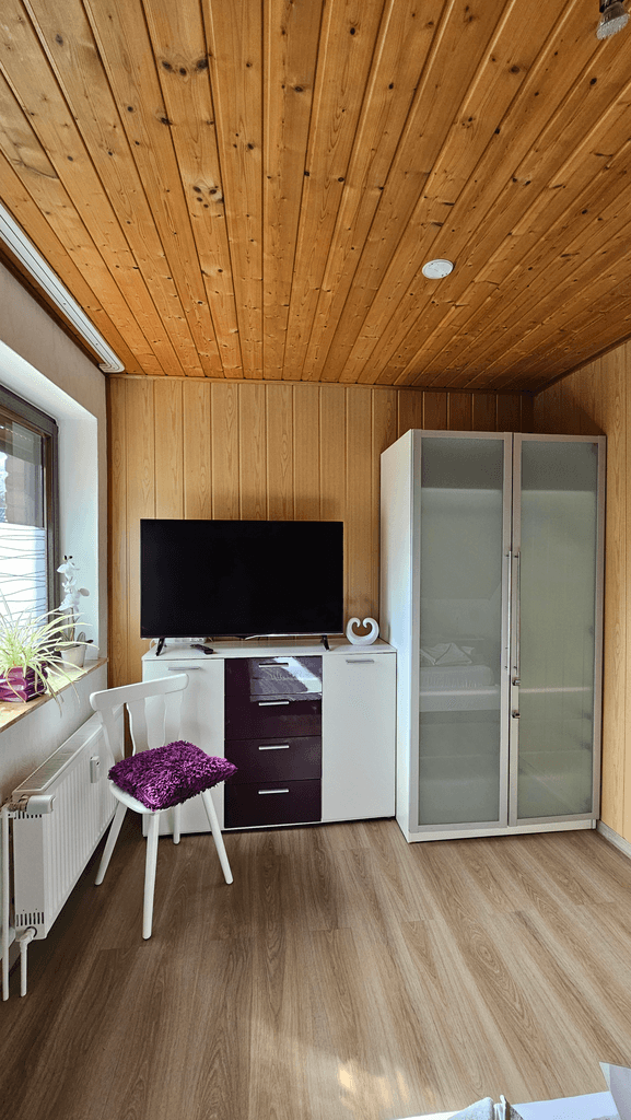 Einzelzimmer: ca. 12 m² mit SAT-TV Anschluss, Bett 90 x 200 cm mit Naturholzgestell, Nachttisch mit Nachttischlampe, Kleiderschrank, Rattansessel sowie Rattantisch und Veluxfenster mit Innenrollo.