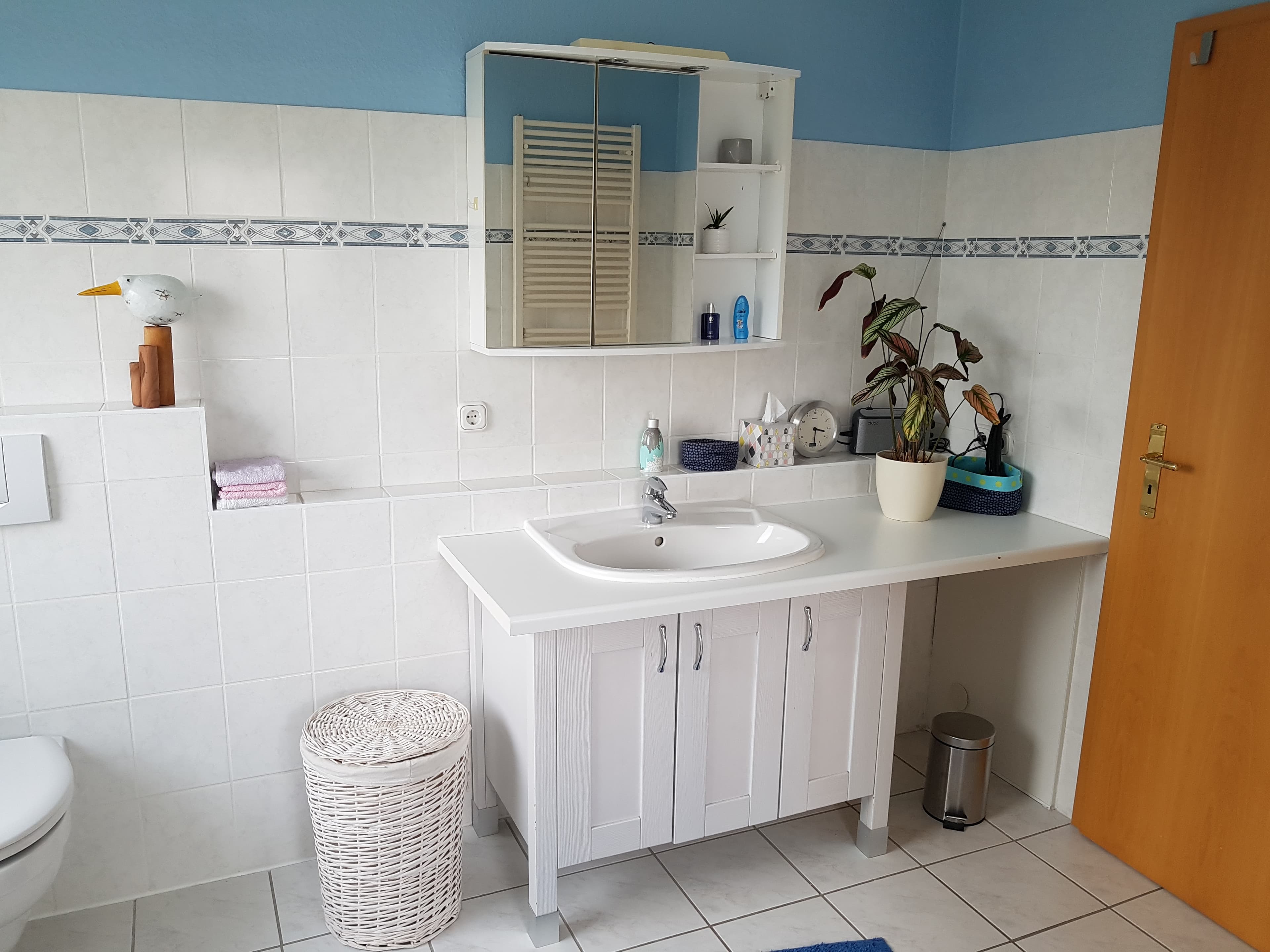 Im Badezimmer sind eine Dusche, ein Bidet und eine Badewanne vorhanden. Die Dusche ist nicht ebenerdig montiert, aber über einen flachen Einstieg zu erreichen. Waschmaschine und Trockner sind ebenfalls im Badezimmer.