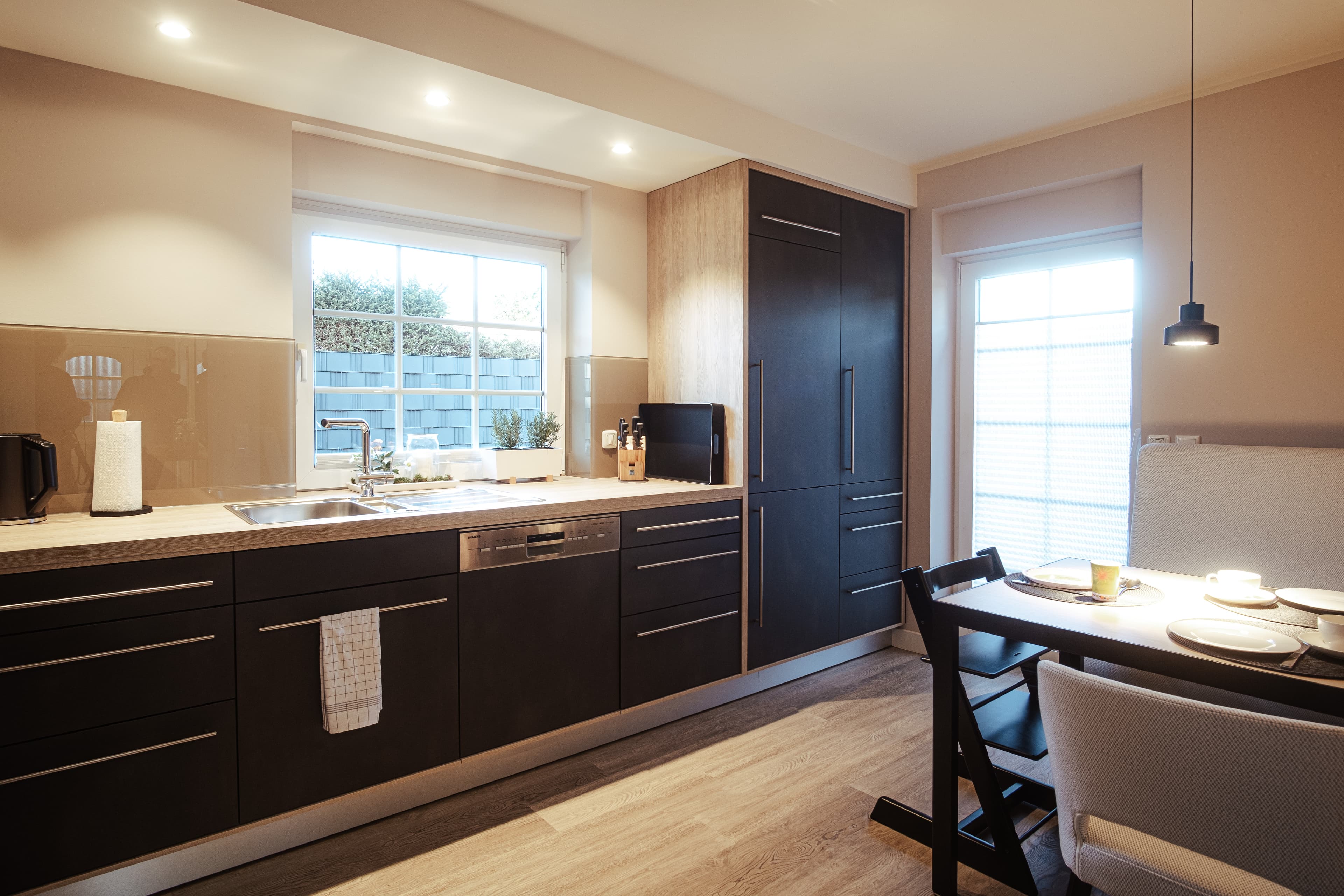 Spülmaschine, Induktionskochfeld, Mikrowelle und Ofen (beides in Arbeitshöhe), großer Kühlschrank, Tiefkühler, Kaffeemaschine, Eierkocher, Wasserkocher, Toaster bis hin zum Salz- und Pfefferstreuer steht Euren Kochkünsten nichts im Wege und die Sitzecke für acht Personen ist so großzügig, dass direkt in der Küche auch gegessen werden könnte.