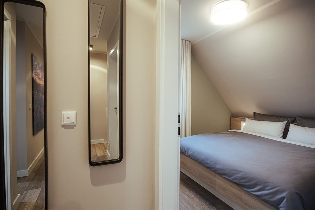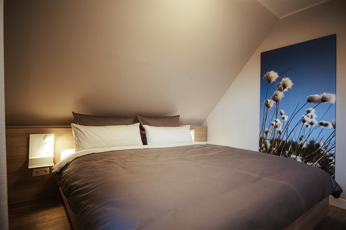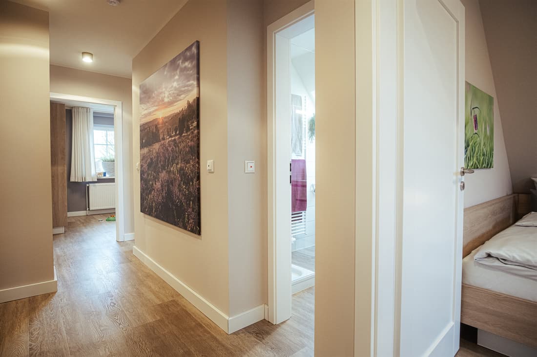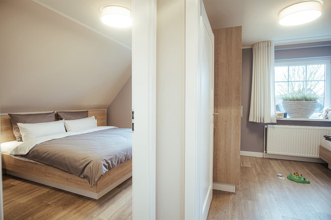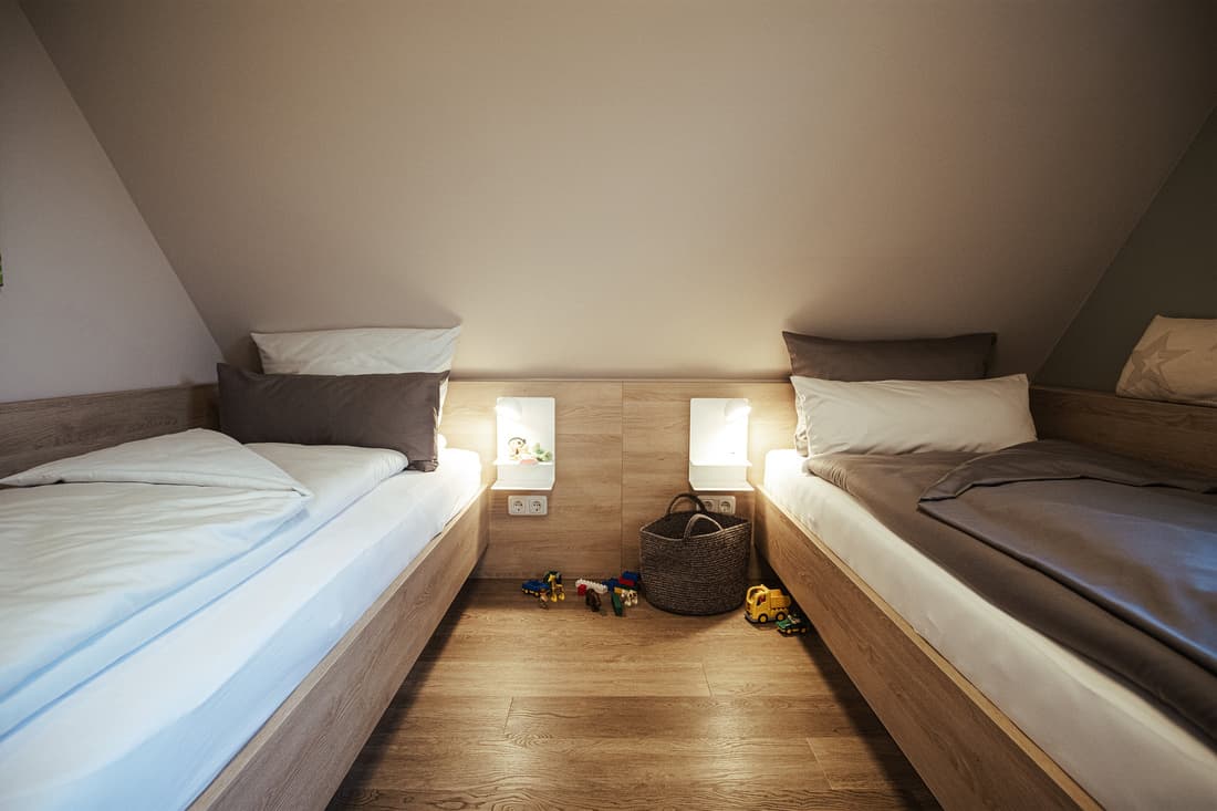 Im Obergeschoss verfügt die "Schicke Bude" über vier modern eingerichtete Schlafzimmer. Zwei Zimmer sind mit Doppelbetten, die anderen zwei Zimmer sind mit je zwei Einzelbetten ausgestattet. Die Belegungsmöglichkeiten der Zimmer sind entsprechend flexibel.