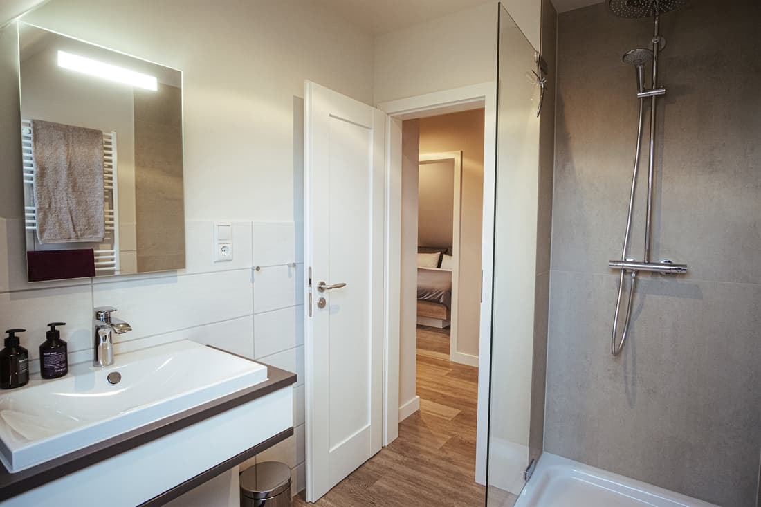Die beiden Dusch-Badezimmer sind mit je einem Waschtisch, modernen Regenkopfduschen und Fußbodenheizung ausgestattet, außerdem verfügen sie je über ein WC und einen Föhn.