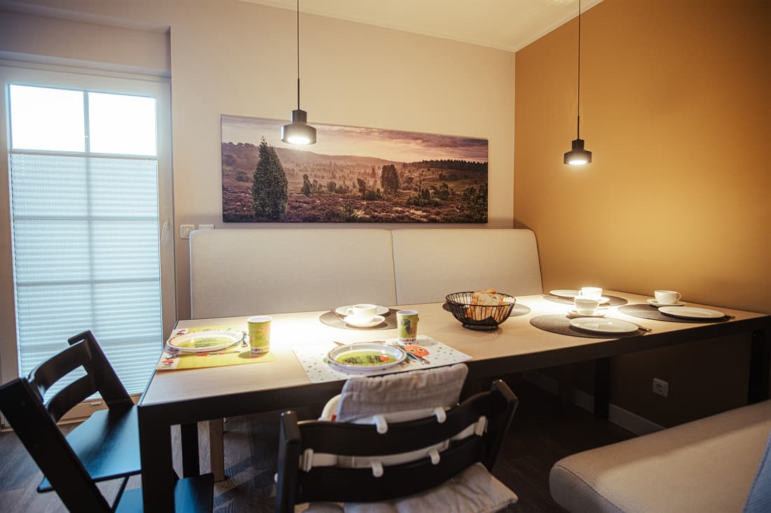 Im angrenzenden Essbereich erwartet Euch der großzügige Esszimmertisch mit seinen acht gemütlichen Stühlen und zwei "Trip-Trap" Kinderstühlen, die auf Wunsch entweder mit einem Newborn-Set oder einem Babyset ausgerüstet werden können. Hier kann gemeinsam gegessen werden oder Ihr lasst den Tag mit einem Spieleabend gemütlich ausklingen. Das Esszimmer bietet sehr viel Großzügigkeit und Flexibilität.