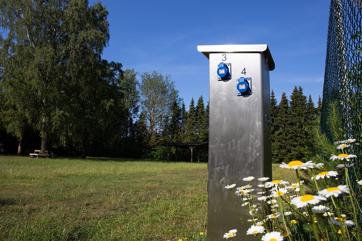 Der Wohnmobilstellplatz ist eine Rasenfläche, mit Sitzmöglichkeiten und einer Stromsäule mit 8 Steckplätzen. Berechnung: kWh / 0,50 €