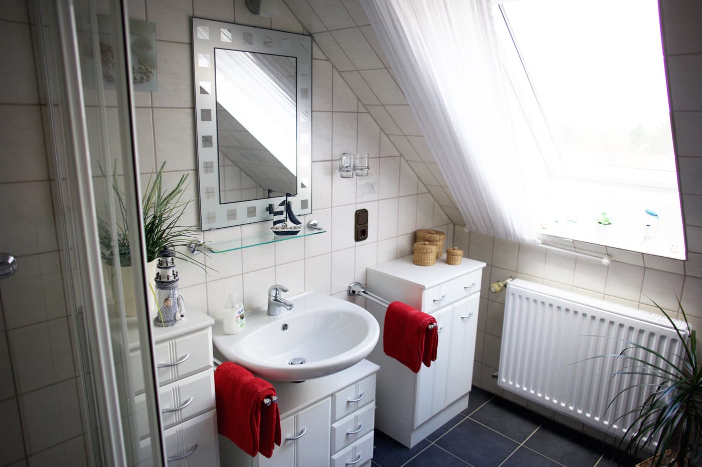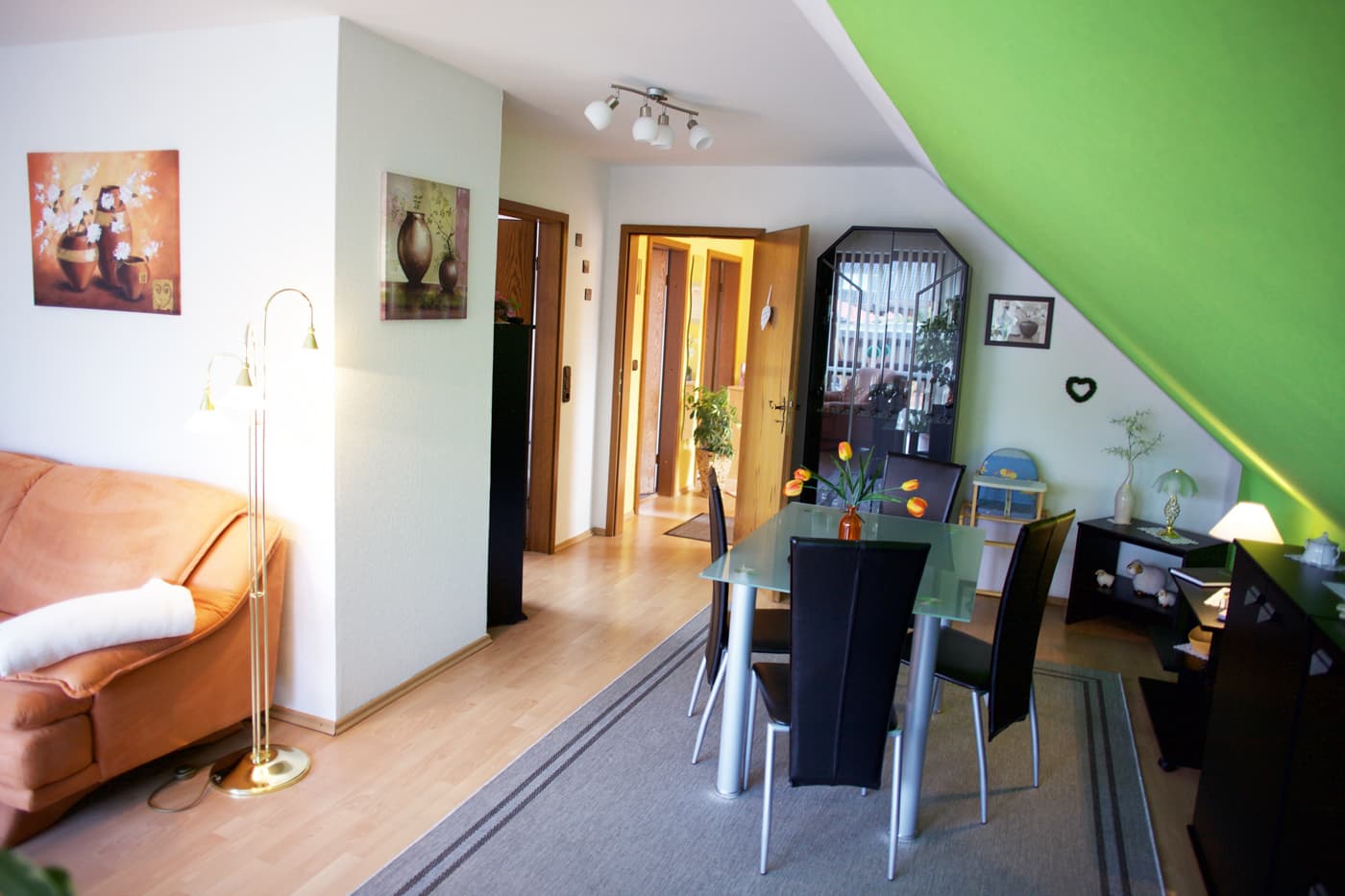 Die Ferienwohnung im Obergeschoss bietet ein großes Wohnzimmer mit Esstisch und Sat-TV-Anlage und gemütlicher Sitzecke. Die Einbauküche ist mit Herd, Geschirrspüler, Mikrowelle, Kaffee-Maschine, Toaster etc. voll ausgestattet.