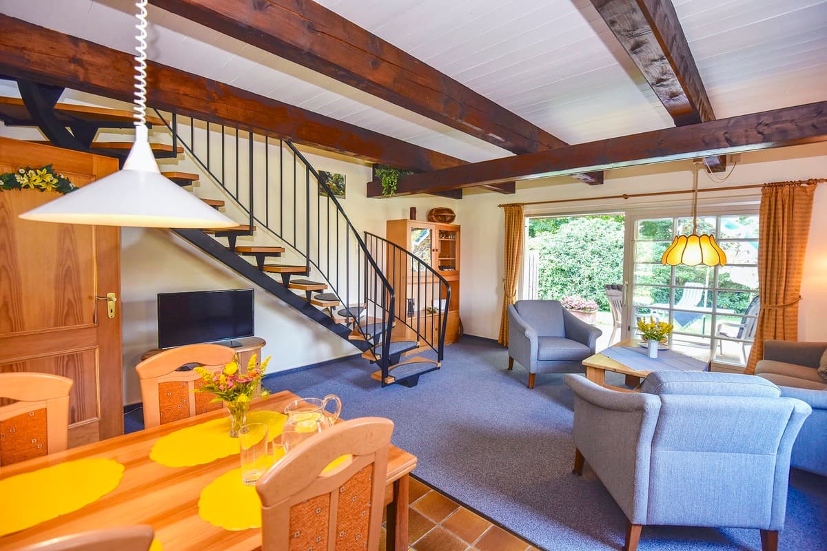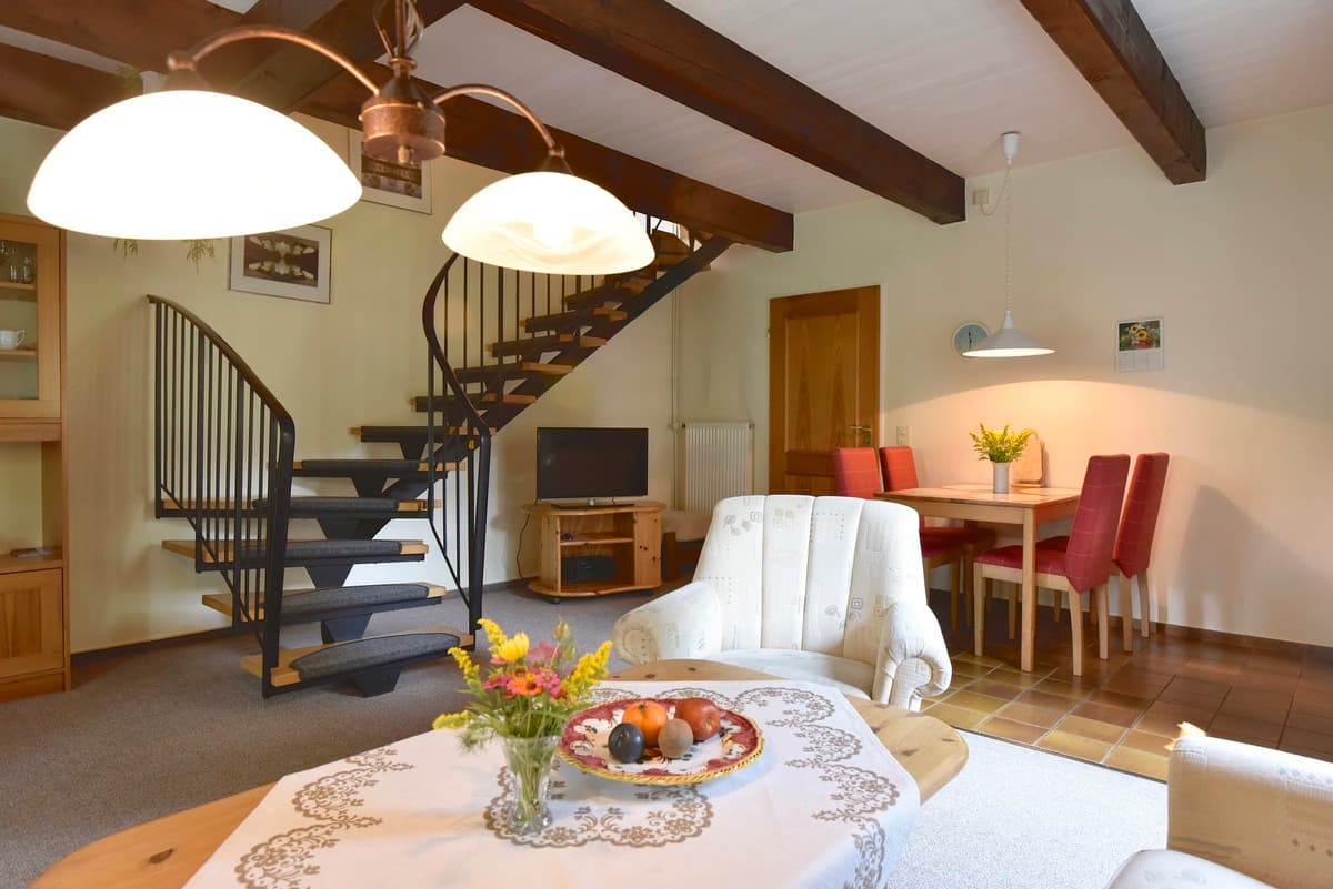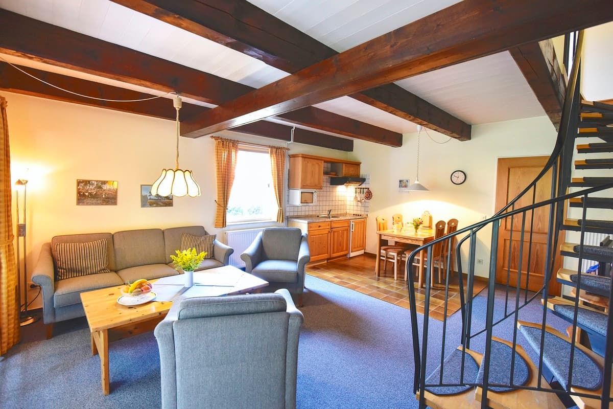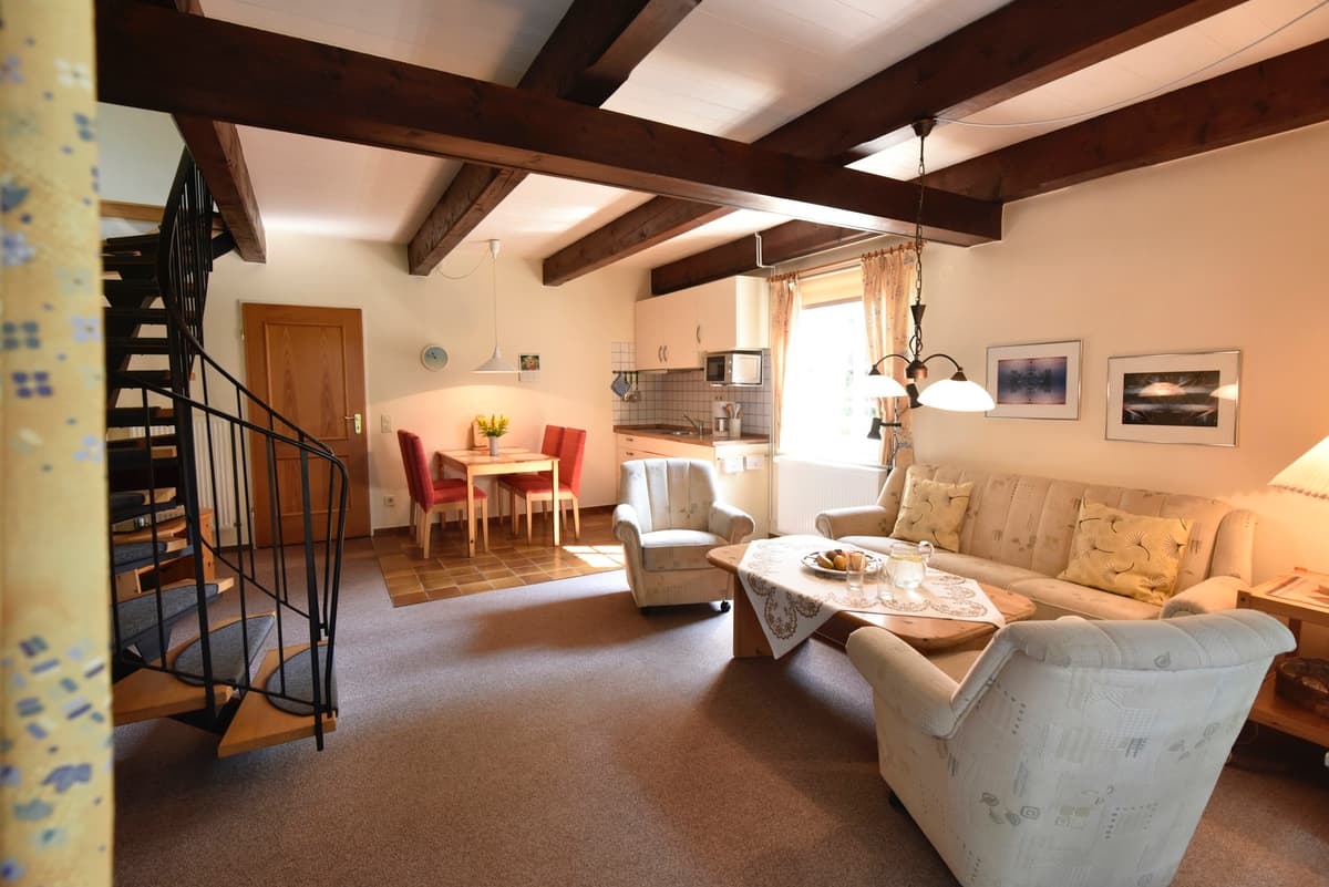 - ein großes Wohnzimmer mit Küchen- und Essecke, Dusche/WC, Extra WC im Obergeschoss