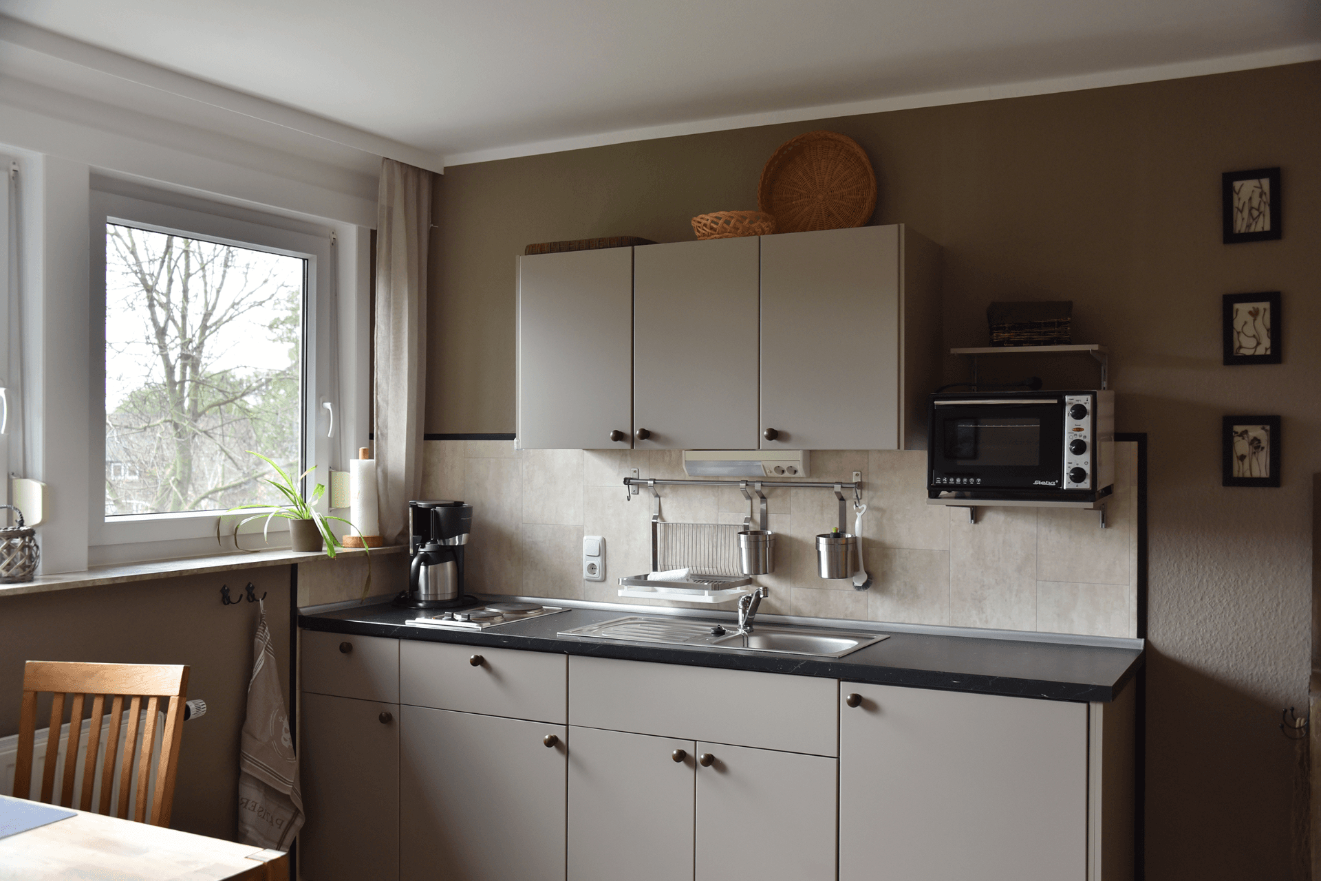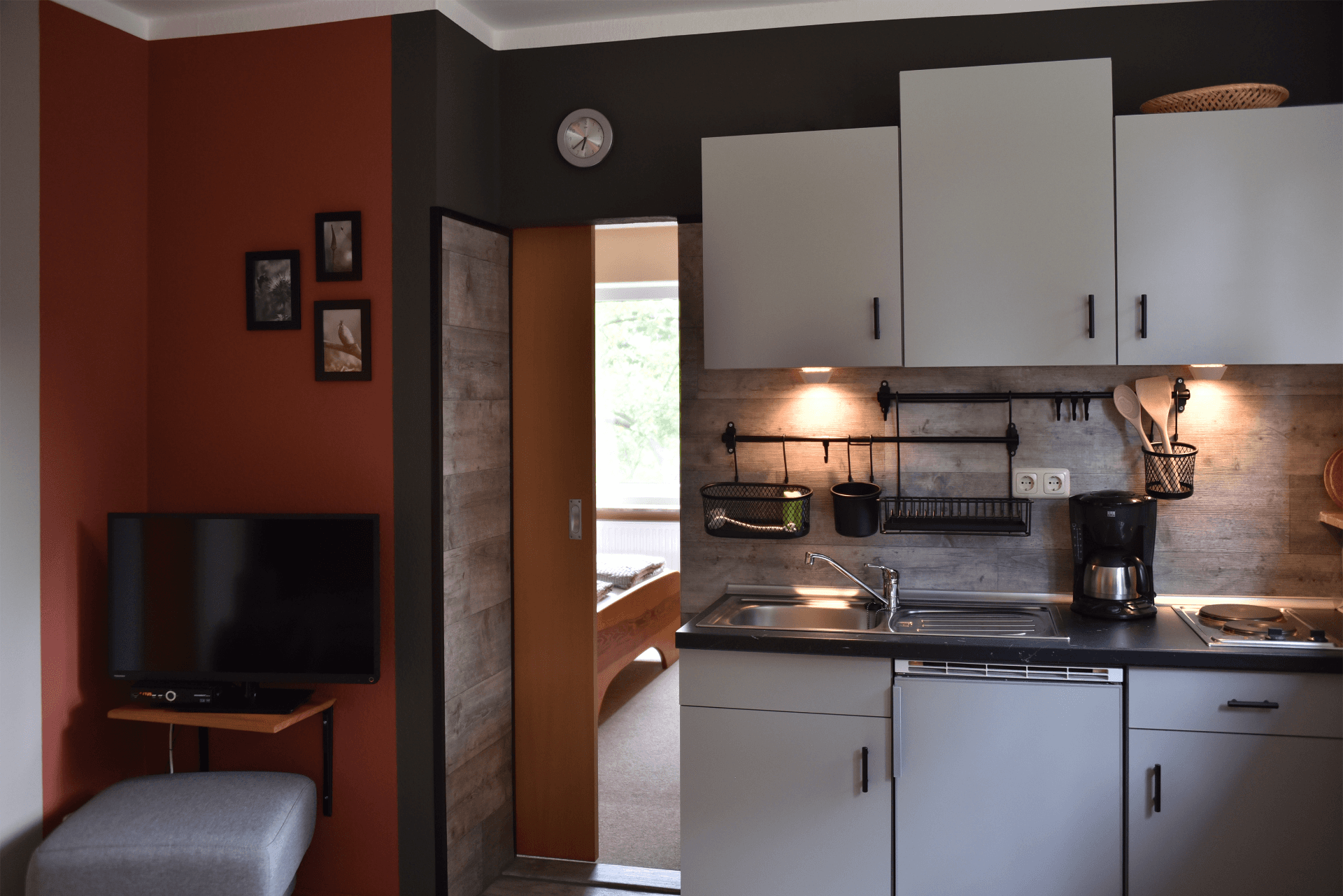 - Essplatz mit integrierter Küchenzeile (inkl. 2-Plattenherd, Mini-Backofen, Kaffeemaschine, Wasserkocher, Toaster)