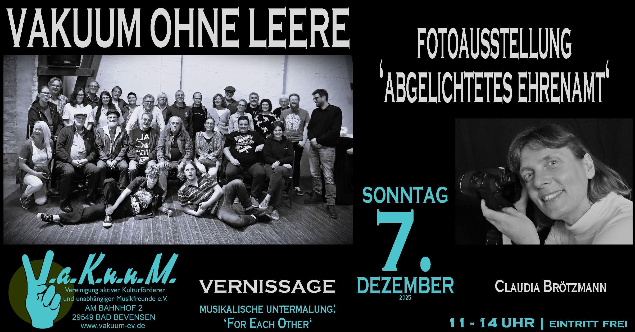 Mein Name ist Claudia Brötzmann und ich wohne in Bienenbüttel. Im Februar 2024 bin ich zufällig auf den VaKuuM e.V., welcher ein sehr vielfältiges, musikalisches und kulturelles Programm bietet, gestoßen. Dort wurde ich durch die Live Musik und der tollen Lokation dazu inspiriert, meine Fotos in den Räumen auszustellen. Ich wurde von tollen, offenen und sympathischen Menschen dabei unterstützt. Durch die im September stattfindende Vernissage mit Live Musik, habe ich den Verein sehr schätzen gelernt. Um mich für die gelungene Ausstellung bei dem Vakuum Team zu bedanken, ist mir die Idee gekommen, die ehrenamtlichen MitarbeiterInnen zu fotografieren und ihnen eine Ausstellung zu widmen. Die angebotenen Shooting Termine wurden mit viel Begeisterung und Motivation angenommen und haben dem Team und mir wirklich großen Spaß gemacht, sodass außergewöhnliche Bilder entstehen konnten.