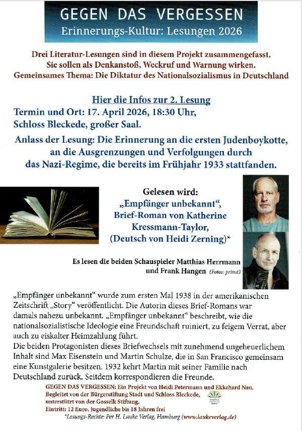 BleckedeDie Lesung beschäftigt sich mit den Erinnerungen an die ersten Judenboykotte, an die Ausgrenzung und Verfolgungen durch das Nazi-Regime , die bereits im Frühjahr 1933 stattfanden.