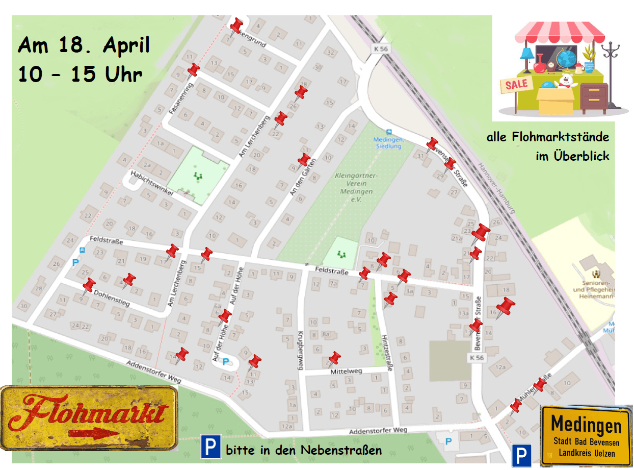 Bad BevensenWir laden euch herzlich zu unserem Frühjahrs-Flohmarkt ein! Schlendert durch das schöne Medingen, genießt die frische Frühlingsluft und entdeckt tolle Schnäppchen. Stände findet ihr in der Bevenser Straße, der Feldstraße, „An den Gärten“, am Lerchenberg und mehr...